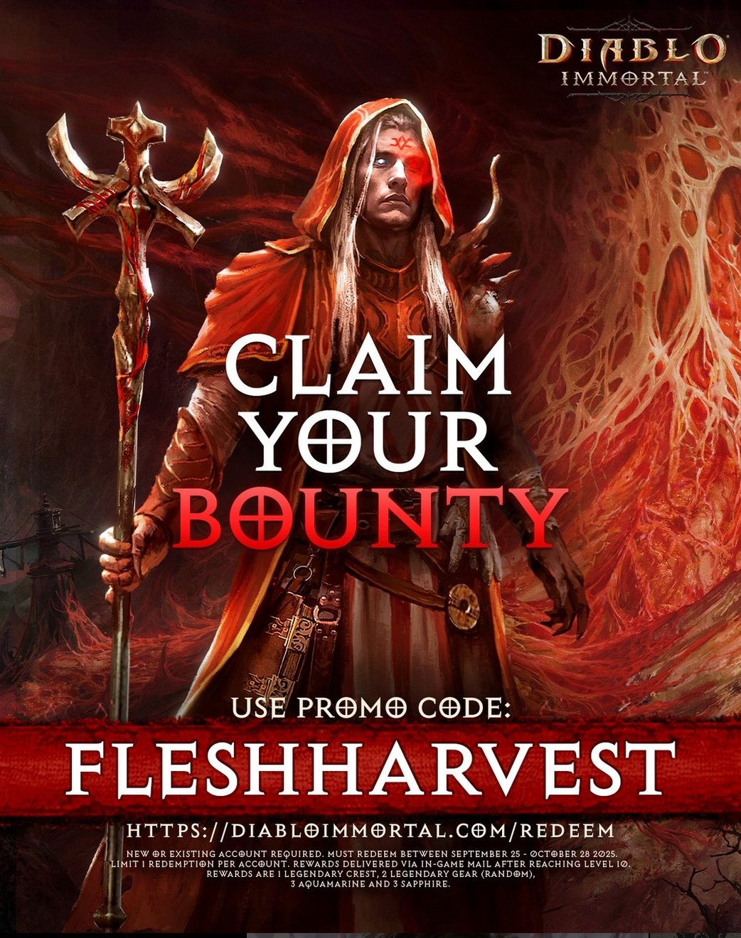 New players can redeem code “LEGENDARY” at http://DiabloImmortal.com/Redeem within 72 hours of Diablo Immortal account creation to receive chests that will provide additional Legendary Gear and Set Items as you level up !